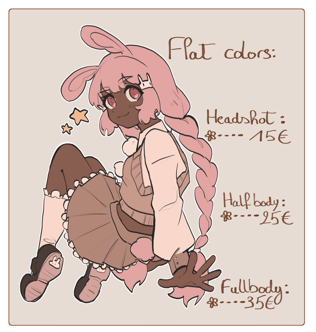 • Flat colored: front + back + headshot + details + simple background: 125€